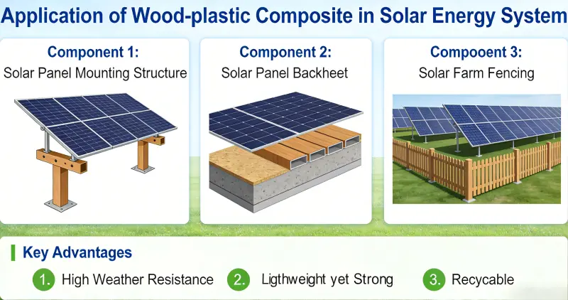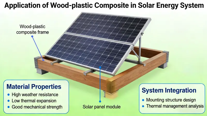 வூட்-பிளாஸ்டிக் கலவை (WPC) சூரிய ஆற்றல் அமைப்புகளில் ஒரு முக்கிய பொருளாக உருவெடுத்துள்ளது, இதில் ஒளிமின்னழுத்த (PV) மவுண்ட்கள், மிதக்கும் மின் நிலையங்கள், PV கட்டிட ஒருங்கிணைப்பு மற்றும் செறிவூட்டப்பட்ட சூரிய சக்தி (CSP) சேமிப்பு ஆகியவை அடங்கும். இது பாரம்பரிய உலோகம் மற்றும் மரப் பொருட்களை படிப்படியாக மாற்றுகிறது.